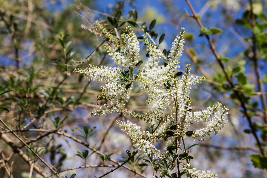 Beebrush is a drought-tolerant shrub with narrow leaves and white, fragrant flowers. It is a pollinator magnet and a honey plant. Many granivorous birds, such as goldfinches, eat the seeds.