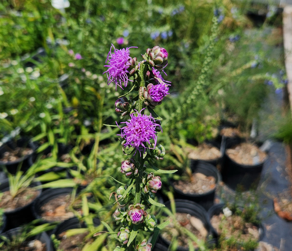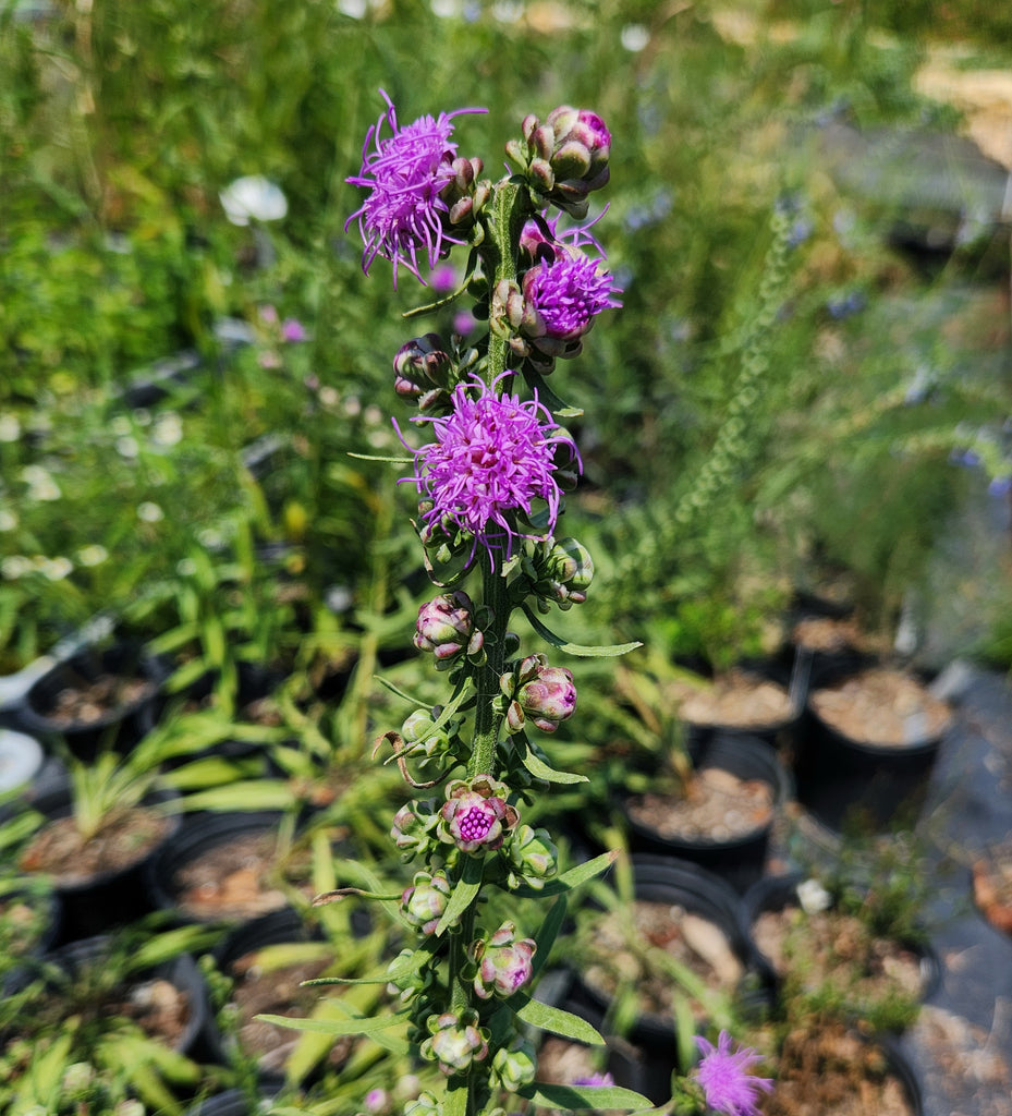 Rough Gayfeather likes a dry to medium soil and a sunny spot. It sometimes needs two years before blooming. Overwatering will cause root rot.  Pollinators flock to Rough Gayfeather and the seeds are eaten by birds.