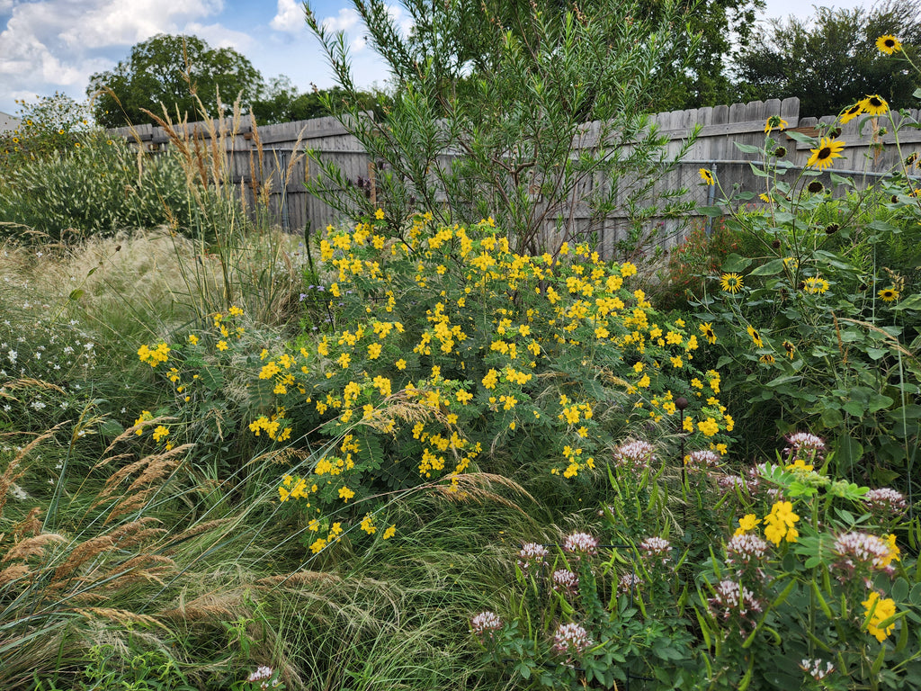 Lindheimer Senna is an erect, bushy perennial with yellow blooms. It grows in sun or part shade, in shallow limestone soil, on hillsides or dry, rocky fields. Its leaves are gray, thick and have a velvety texture. It is effective in a wildflower garden as either a specimen, or background plant. Birds and other wildlife eat the seeds.